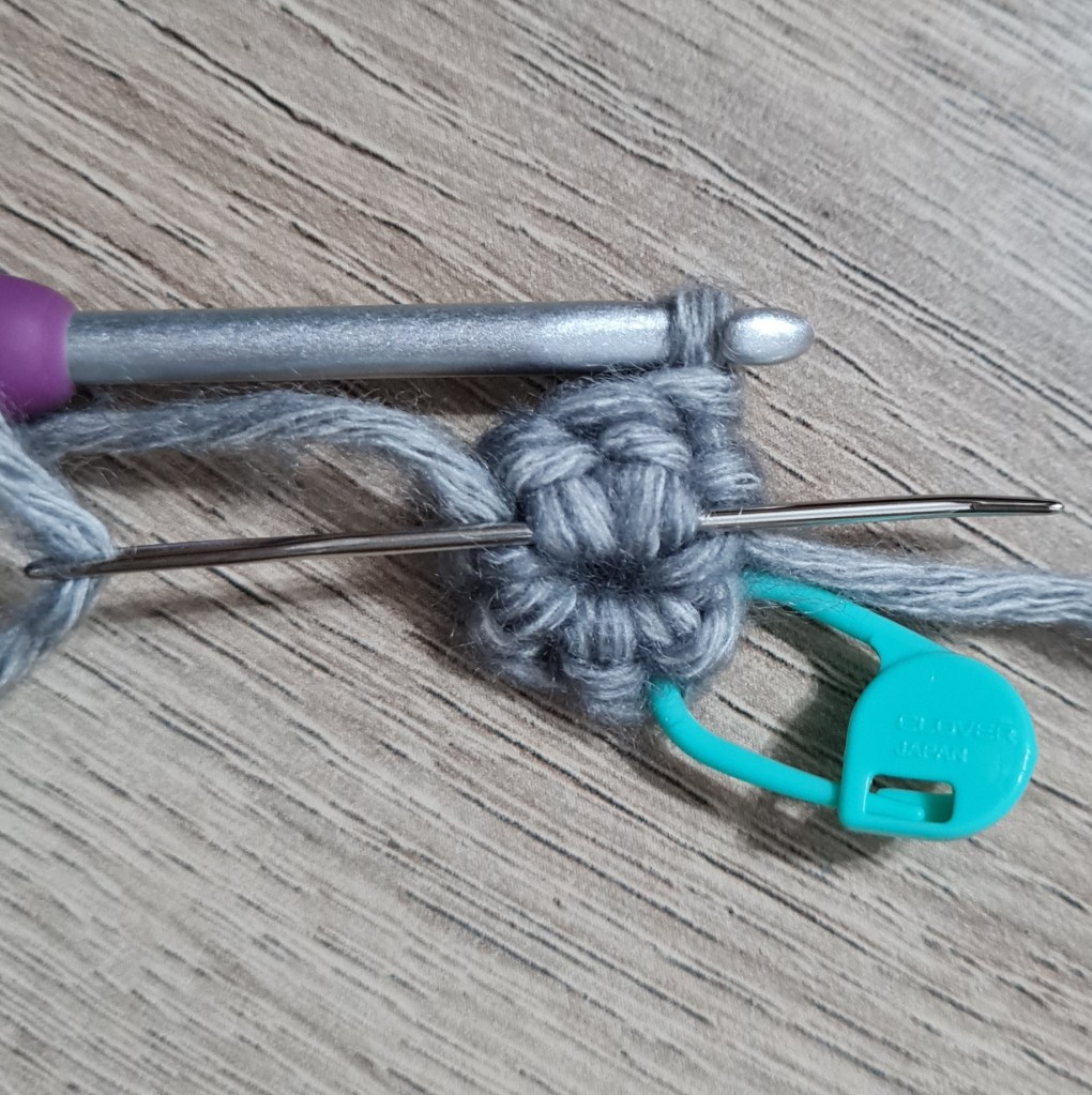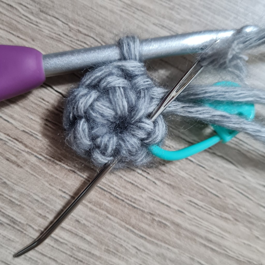 5. If you have a small hole in the middle of your starting ring, turn it over and sew the tail end in – going around the back of the stitches – gently pull it tight