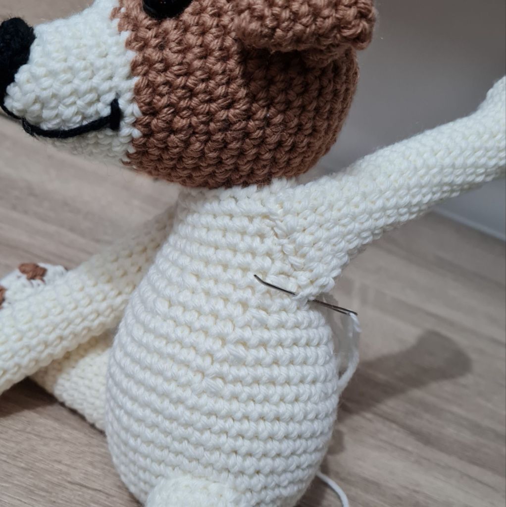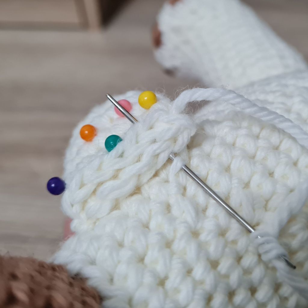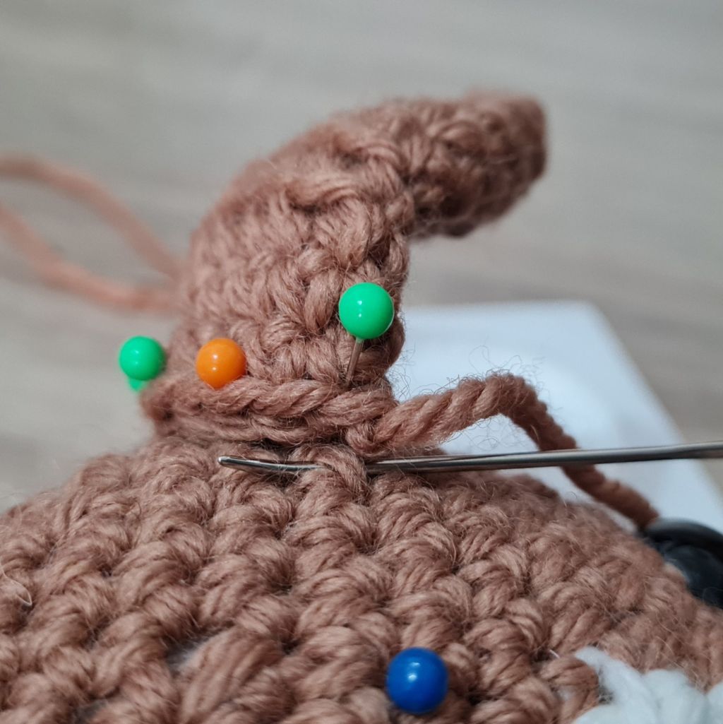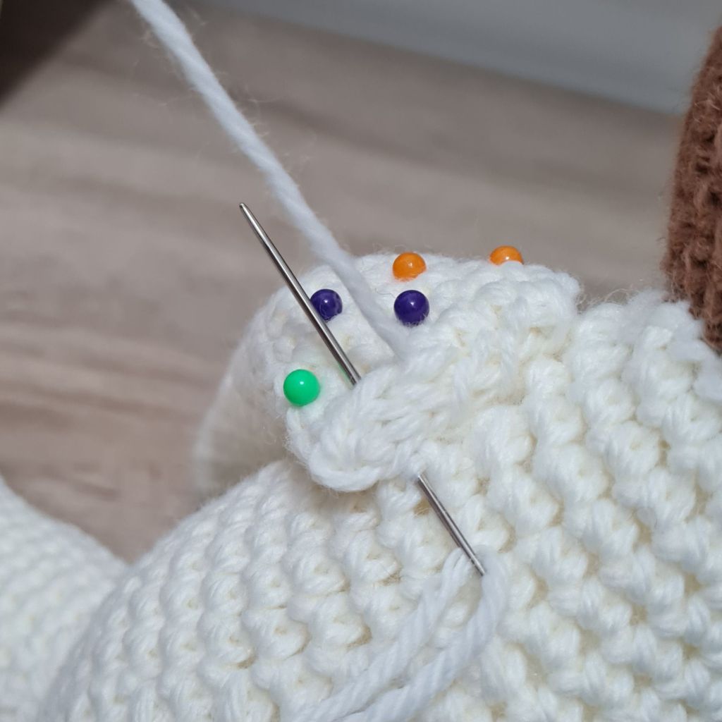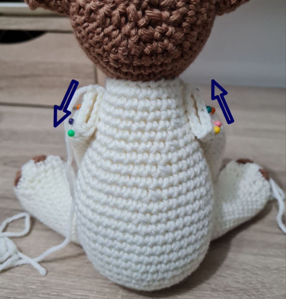 For a piece that is hanging down, like a front leg (or sometimes an ear), make sure you have left the the top few rounds un-stuffed and line up the loops on the front and back of the leg before pinning onto the body: