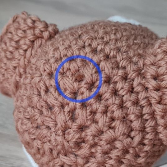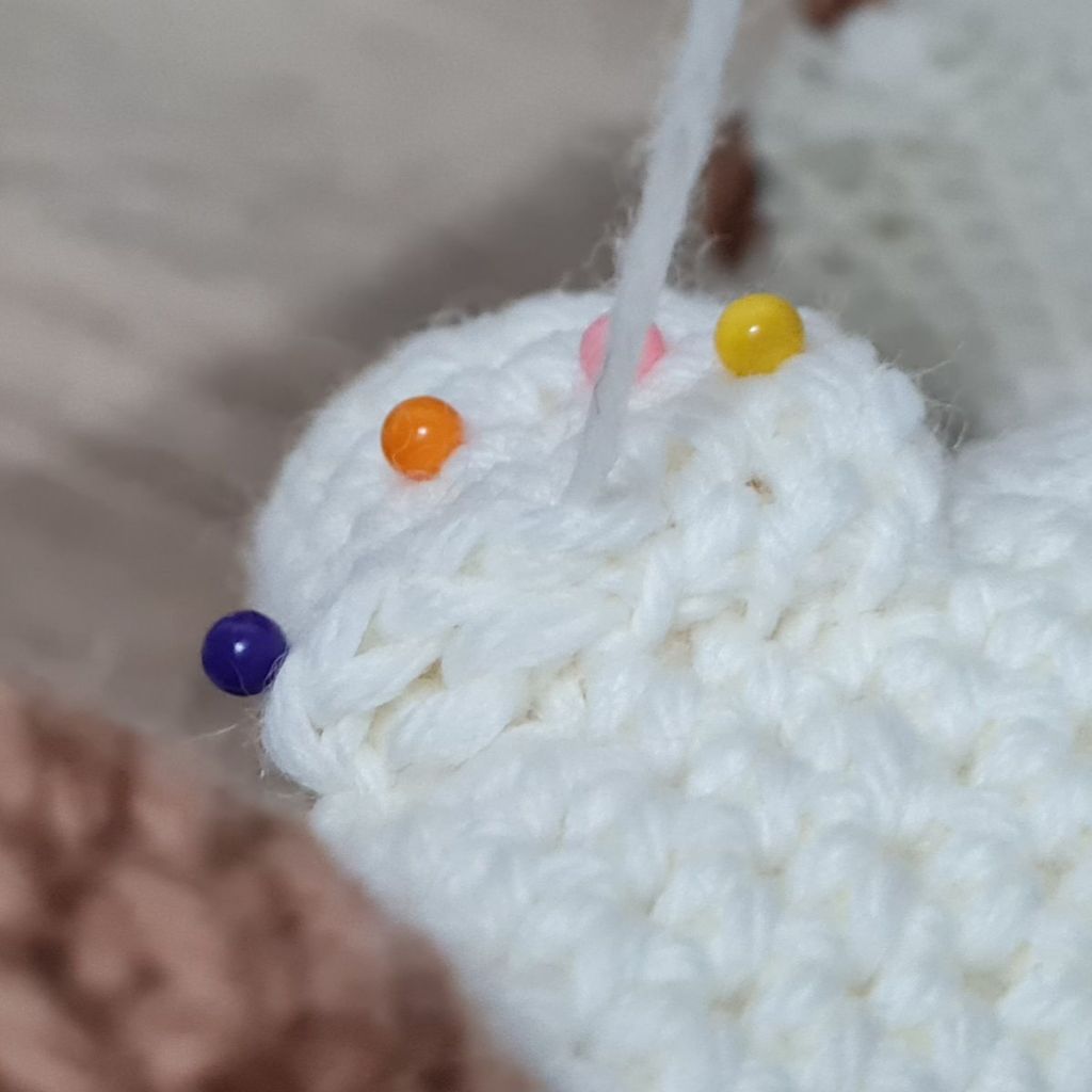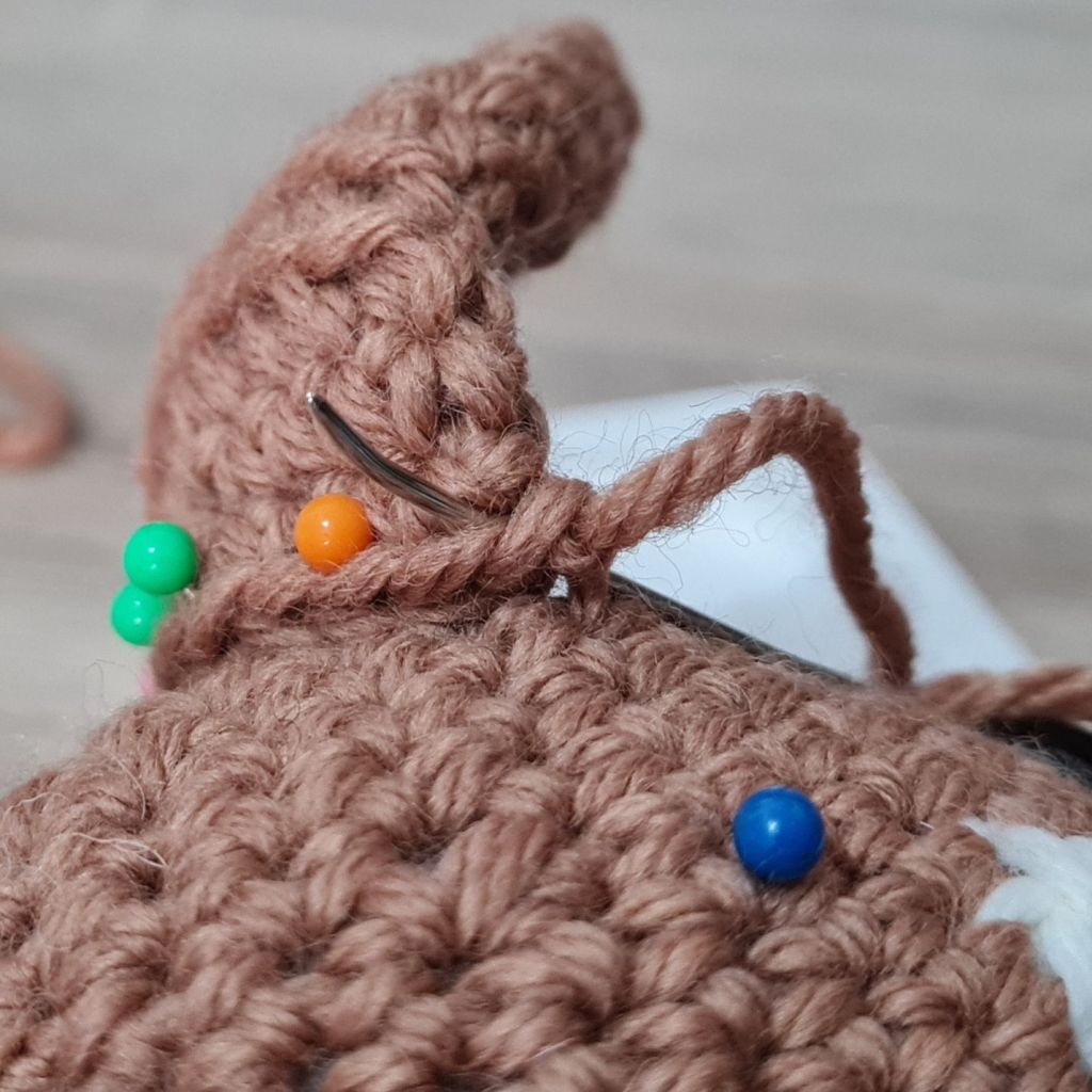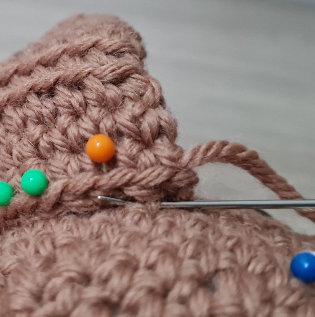 If I want the edge of a flat piece to be a little more defined, or neater, I will sew the piece on using the back loop only, going anti-clockwise around – using this method, the front loop is untouched and visible after the sewing. I use this method sometimes for noses, muzzles, mouths (insert the needle through a stitch on the piece it’s being sewn onto, pull up through the back loop only of the stitch on the flat piece, pull tight and repeat all around)
