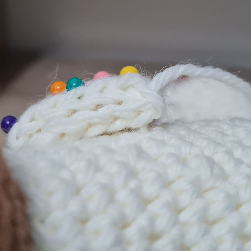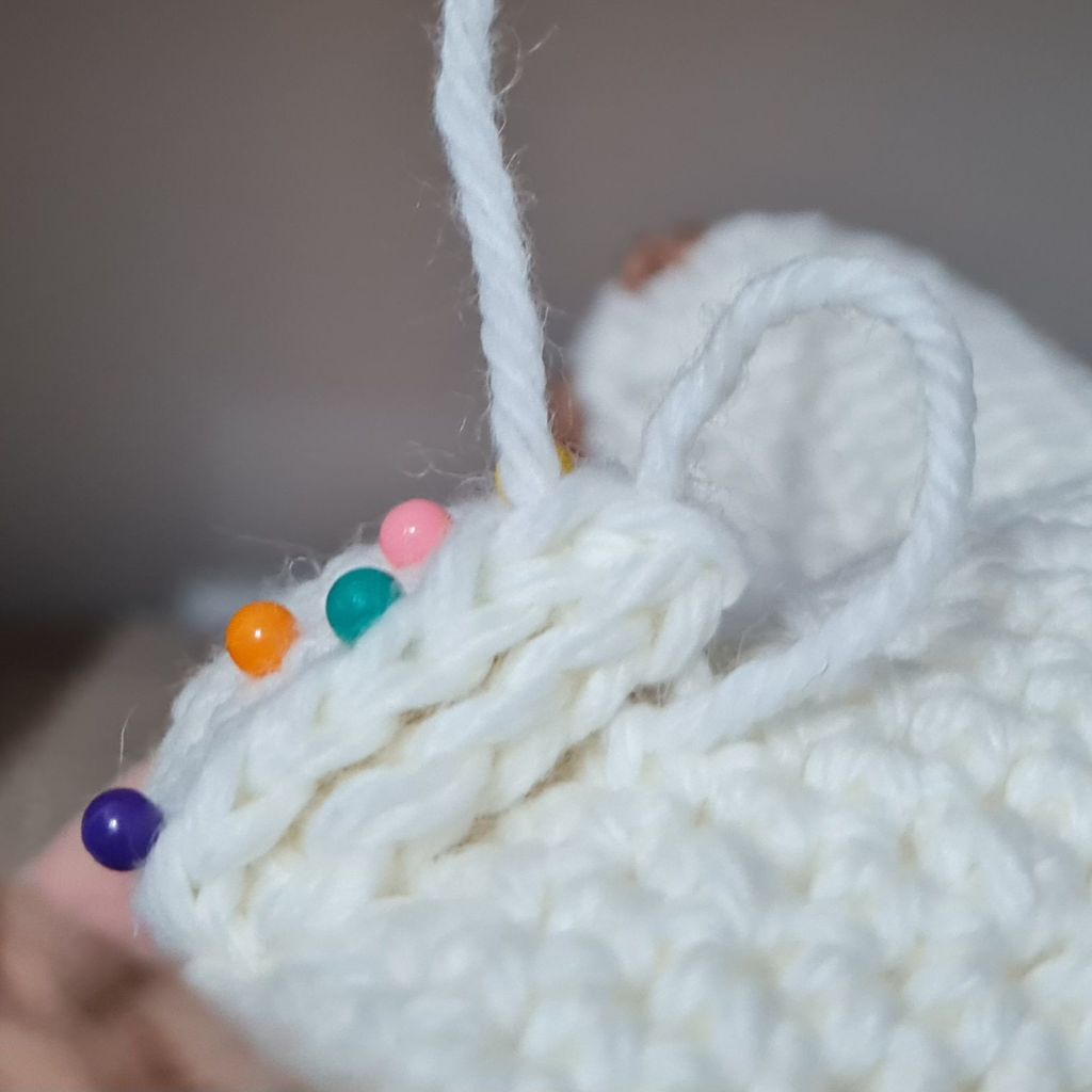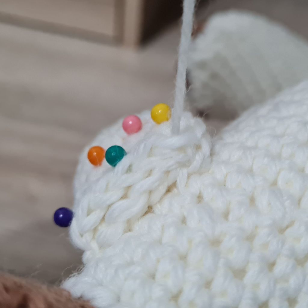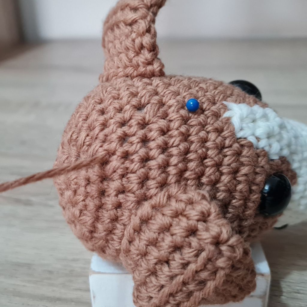 If I want the edge of a flat piece to be a little more defined, or neater, I will sew the piece on using the back loop only, going anti-clockwise around – using this method, the front loop is untouched and visible after the sewing. I use this method sometimes for noses, muzzles, mouths (insert the needle through a stitch on the piece it’s being sewn onto, pull up through the back loop only of the stitch on the flat piece, pull tight and repeat all around)